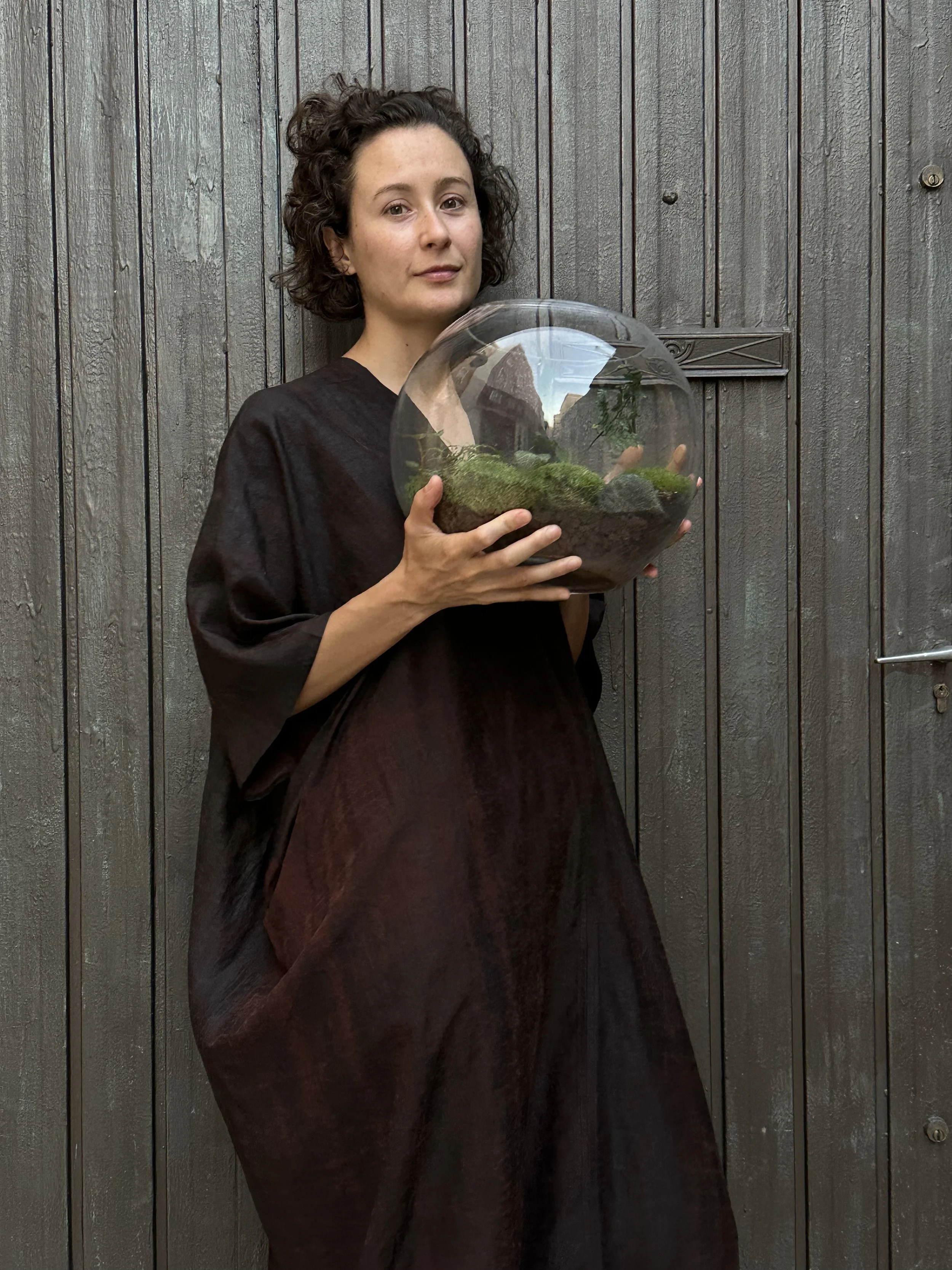 Tiziana Domínguez is a multidisciplinary Spanish creative whose work bridges fashion, art, and environmental consciousness. As former Creative Director of Adolfo Domínguez, she championed sustainability by launching the brand’s “Green Me” line and implementing an animal welfare policy that eliminated exotic skins. In parallel, her artistic practice explores the emotional and organic through mixed-media works—most recently in her solo exhibition “ÁNIMA” at Fundación Cajasol, where she reflected on the soulful presence of horses. Tiziana’s deep connection to nature, texture, and storytelling aligns seamlessly with the spirit of Noir Mud Silk, where craft becomes a medium for meaning, memory, and mindful elegance.